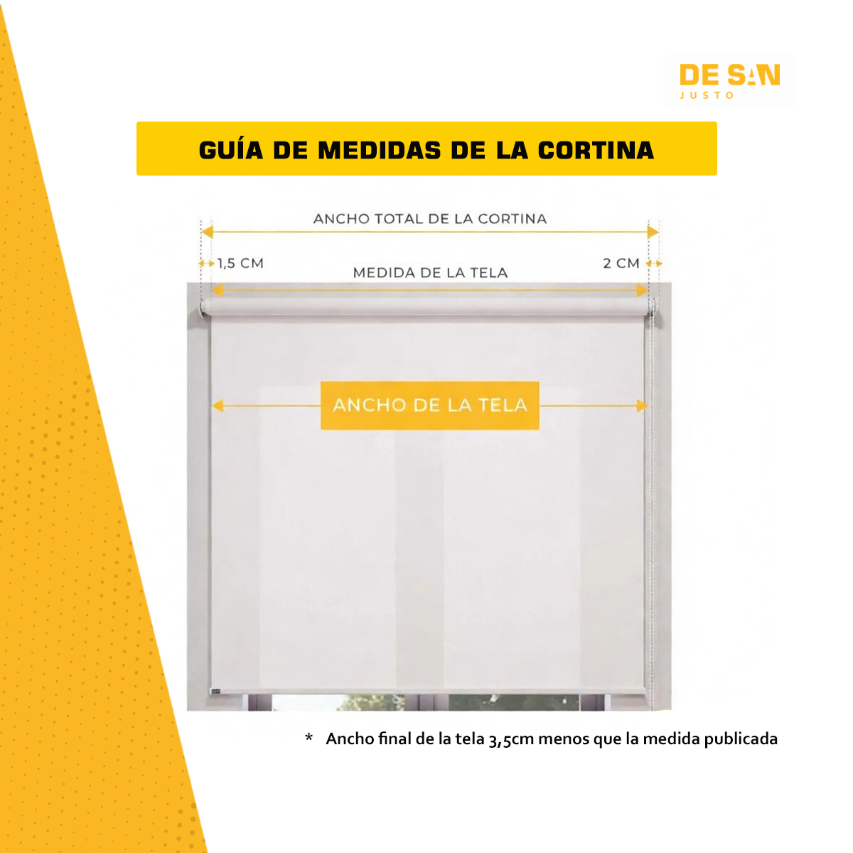 Ancho de la tela: Tenga en cuenta que el ancho final de la tela será 3,5 cm menor que la medida de la cortina publicada. Esta diferencia corresponde al espacio ocupado por los mecanismos de funcionamiento. Ver imagen de la publicación