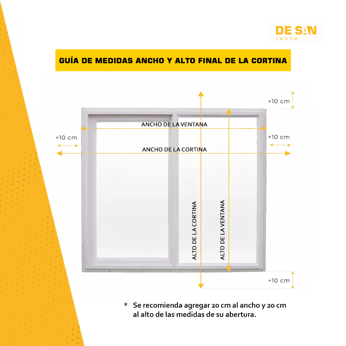 Agregados de tela recomendados: Para un mejor rendimiento de la cortina, se recomienda agregar 20 cm al ancho y 20 cm al alto de las medidas de su abertura. De esta forma se logra una mejor cobertura, se reduce significativamente la entrada de luz y la cortina cumple de manera más efectiva su función.