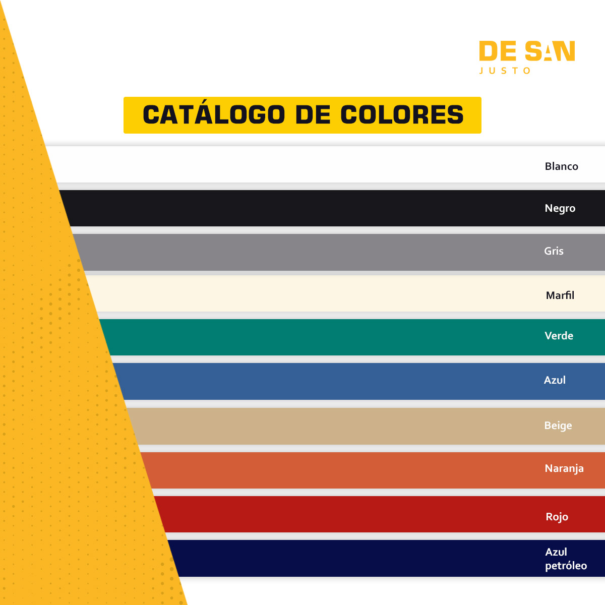 Negro – Blanco – Marfil – Beige Oscuro – Azul – Verde – Gris – Azul Petróleo – Rojo -Naranja